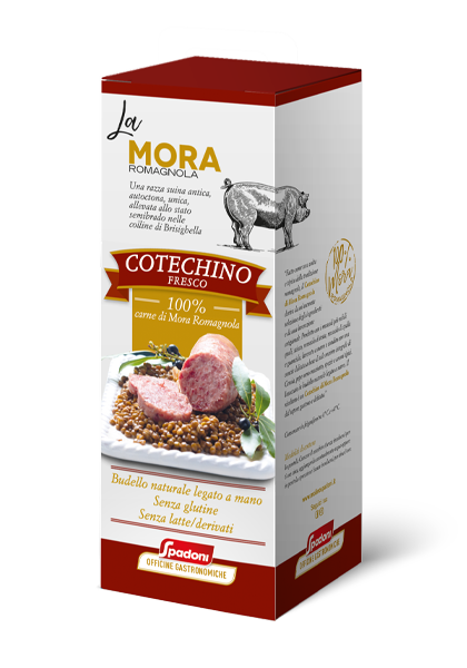 Prodotto con i muscoli più nobili quali, stinco, muscolo di testa, muscolo di spalla e guanciale lavorato a mano e condito con una concia delicata a base di sale marino integrale di Cervia, pepe nero macinato e aromi naturali. Insaccato in budello naturale legato a mano. Il risultato é un cotechino di Mora Romagnola dal sapore gustoso e delicato.