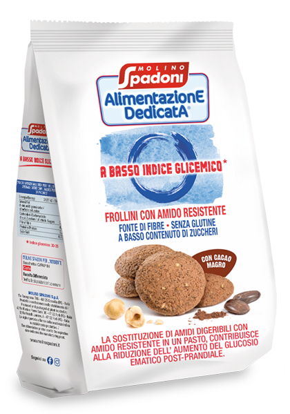 Frollini al gusto di cacao magro e nocciole, con amido resistente e senza glutine; questi frollini sono fonte di fibre, che inglobano gli zuccheri (già presenti in bassa quantità nella ricetta) in un gel viscoso, limitandone la digestione.