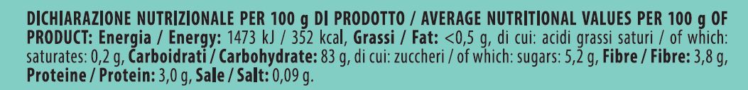 Ingredienti: farina di riso (40%), amido di patate, amido di tapioca, zucchero, fibre vegetali (pisello, patata, psyllium, bambù, semi di lino), addensanti: idrossipropilmetilcellulosa, fibra di semi di lino. Può contenere lupini, soia, senape.