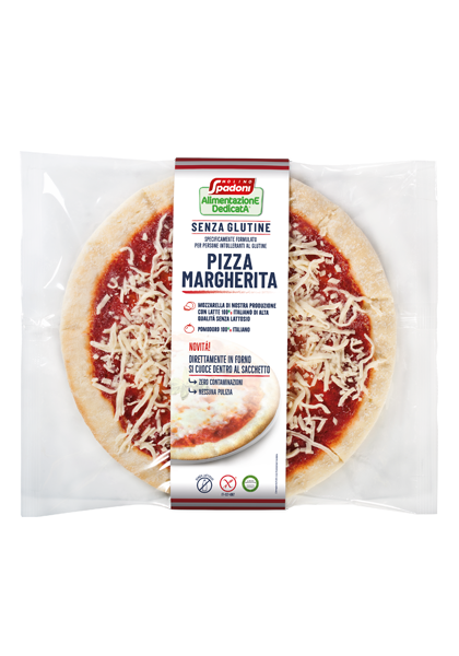 La Pizza Margherita Senza Glutine confezionata nel film per alimenti “ovenable”, cioè che resiste alla cottura in forno, della Linea Senza Glutine di Molino Spadoni, cuoce direttamente nello speciale sacchetto infornabile con barriera anticontaminazione. Questa pizza, precotta e surgelata, è condita con mozzarella di nostra produzione con latte 100% italiano senza lattosio e pomodoro 100% italiano.