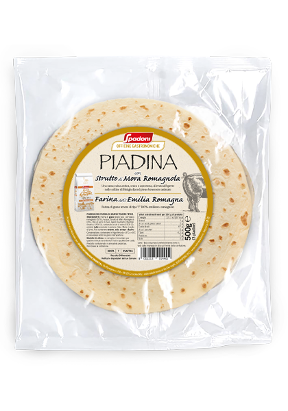 La Piadina Officine Gastronomiche Spadoni è realizzata con Farina di grano tenero di tipo “1”, 100% Emiliano-Romagnolo e con Strutto di Mora Romagnola, che dona un sapore unico e autentico al prodotto.