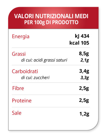 Polpa di pomodoro 49%, Goletta stagionata di suino 23% (Carne di suino, sale marino integrale di Cervia, destrosio, aromi naturali, spezie. Conservante: E252), cipolla 14%, pancetta di Mora Romagnola 4,5%, vino bianco, olio extravergine di oliva, sale marino integrale di Cervia, zucchero, peperoncino.